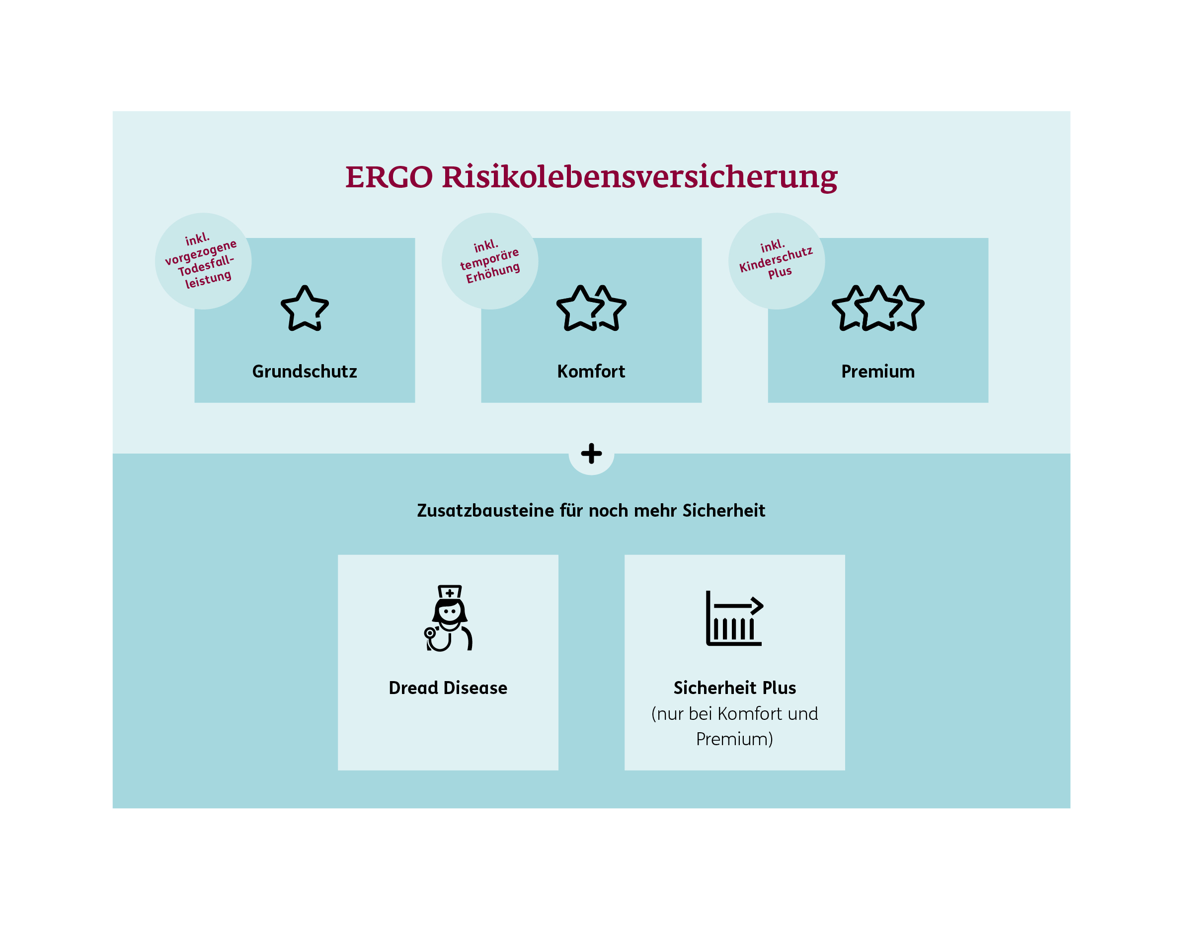 Die Risikolebensversicherung der ERGO gibt es in drei aufeinander aufbauenden leistungsstarken Varianten: Grundschutz, Komfort und Premium.